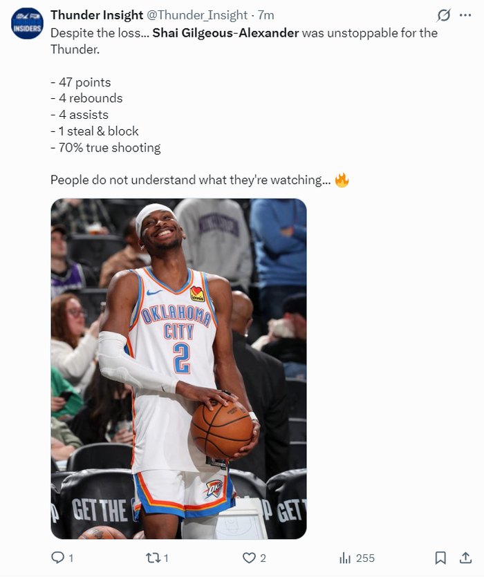 此役SGA创造多项纪录:1.这场比赛SGA延续了自己连续116场20+;
